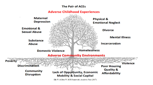This concept of the ‘Pair of ACEs’ Tree proposes that ACEs and trauma are not limited to individual experiences but can also be linked to the environment in which these are experienced (read about this framework in the source document here). People living in adverse community environments might find it harder to contain their levels of stress.