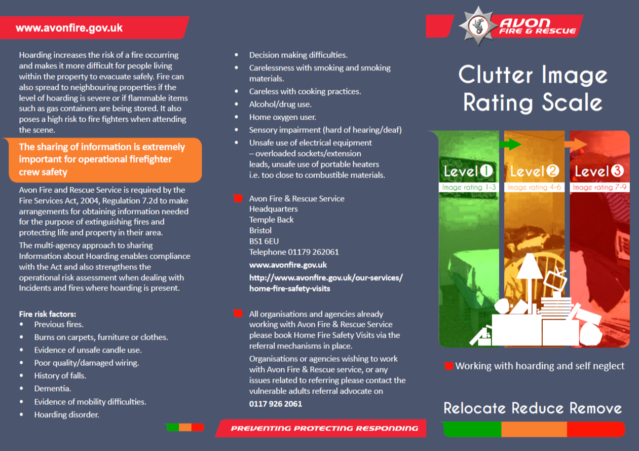 Hoarding is one of the most common forms of self-neglect and of course occurs to various degrees. This resource from Avon Fire and Rescue helps professionals to identify levels of hoarding and suggests appropriate courses of action:
